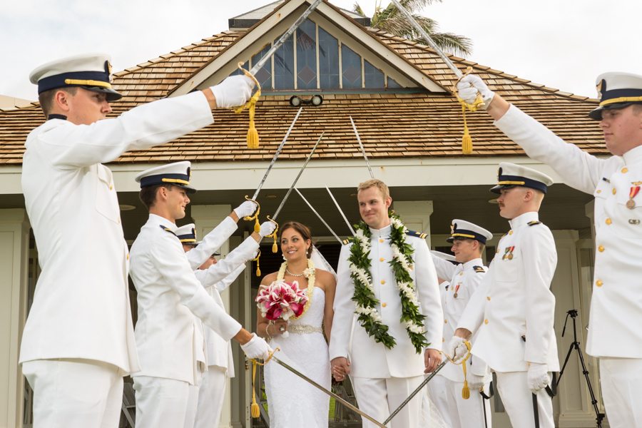 They received the Coast Guard tradition where each pair blocks the couple until they kiss and then pass through to the next pair.