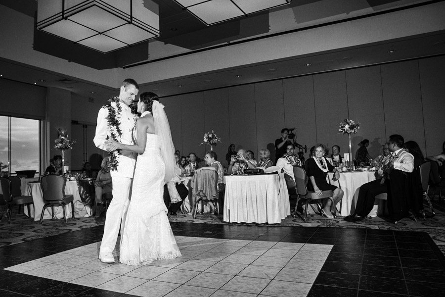 After cocktail hour and sunset portrait session on the point, Jessica + Jess danced to “That’s All”- by Michael Buble in the Kuilima ballroom inside Turtle Bay Resort with a beautiful view of the ocean. The evening rounded out with a hula by a friends daughter, toasts and the story of how Jessica and Jess got together from Jessica’s Father Ken’s view and a surprise video message from Jessica’s brother who was deployed and couldn’t make the wedding.